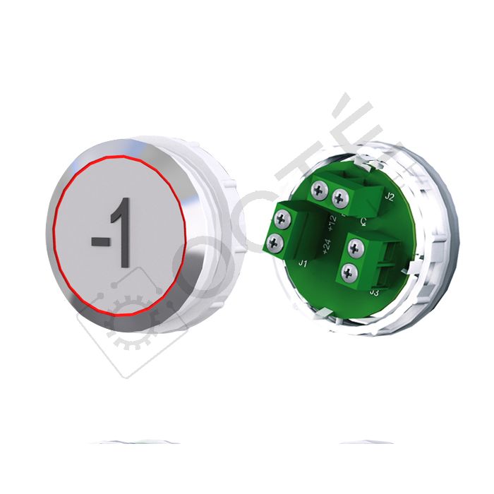Bouton VEGA Achille Cat. 1 (EN81-71) pour boîtes à boutons cabine TOPAZ. Version bornier à vis 12/24V, raccordable à toute armoire acceptant une entrée contact sec, adapté au remplacement à l’identique ou pour remplacer un bouton non antivandale.