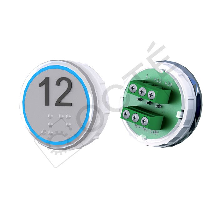 Bouton VEGA Venus XL pour boîtes à boutons cabine TOPAZ. Version bornier à vis 12/24V, raccordable à toute armoire acceptant une entrée contact sec, adapté au remplacement à l’identique.