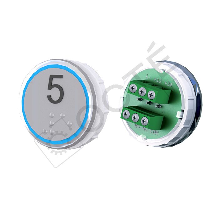 Bouton VEGA Venus XL pour boîtes à boutons cabine TOPAZ. Version bornier à vis 12/24V, raccordable à toute armoire acceptant une entrée contact sec, adapté au remplacement à l’identique.