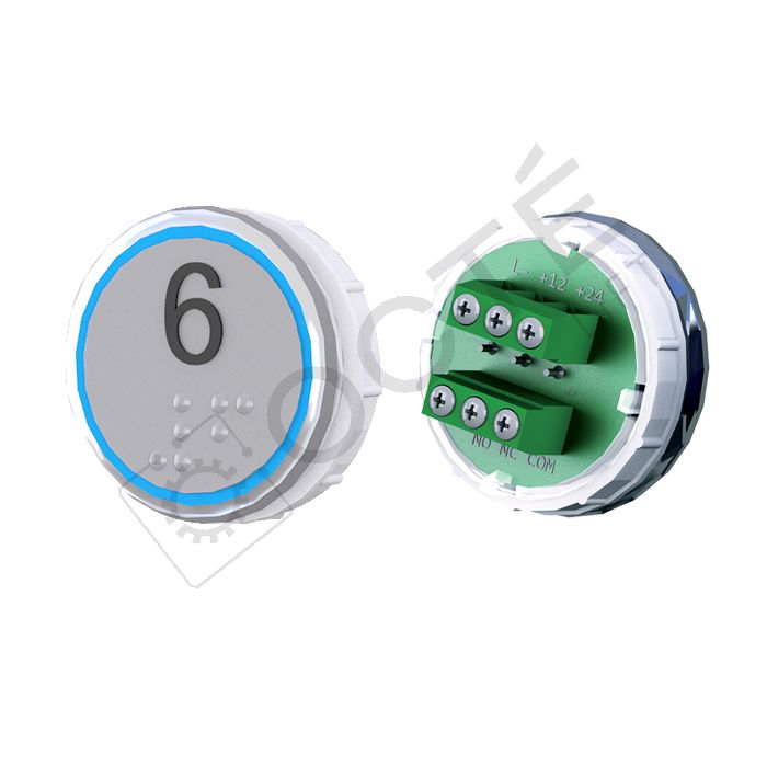 Bouton VEGA Venus XL pour boîtes à boutons cabine TOPAZ. Version bornier à vis 12/24V, raccordable à toute armoire acceptant une entrée contact sec, adapté au remplacement à l’identique.