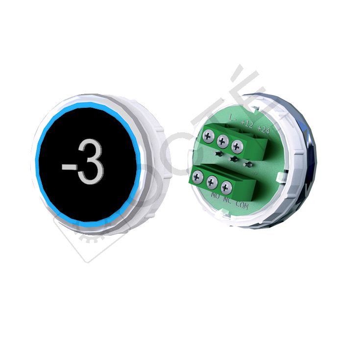 Bouton VEGA Venus XL pour boîtes à boutons cabine TOPAZ. Version bornier à vis 12/24V, raccordable à toute armoire acceptant une entrée contact sec, adapté au remplacement à l’identique.